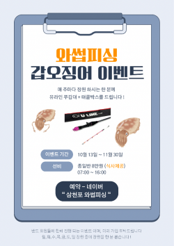 이번주 월화수 쉬고목요일 내일부터 출항합니다~!목요일 자리여유 금요일 자리여유 토,일 예약완료!종일반 갑오징어 8만원 식사제공 간식,컵라면 구비!!주마다 장원에게 낚시대와 태클박스 이벤트까지!!이번주 4일밖에안남았는데쉽게 장원하시고 상품까지 타가세요~!!!*** 삼천포 와썹피싱 예약 안내 ***예약문의 : 010-4143-1338오시는길 : 경남 사천시 팔포3길 56-35 수협냉동창고 바로앞홈페이지 :https://wassup.sunsang24.com밴드 :https://band.us/@wassup